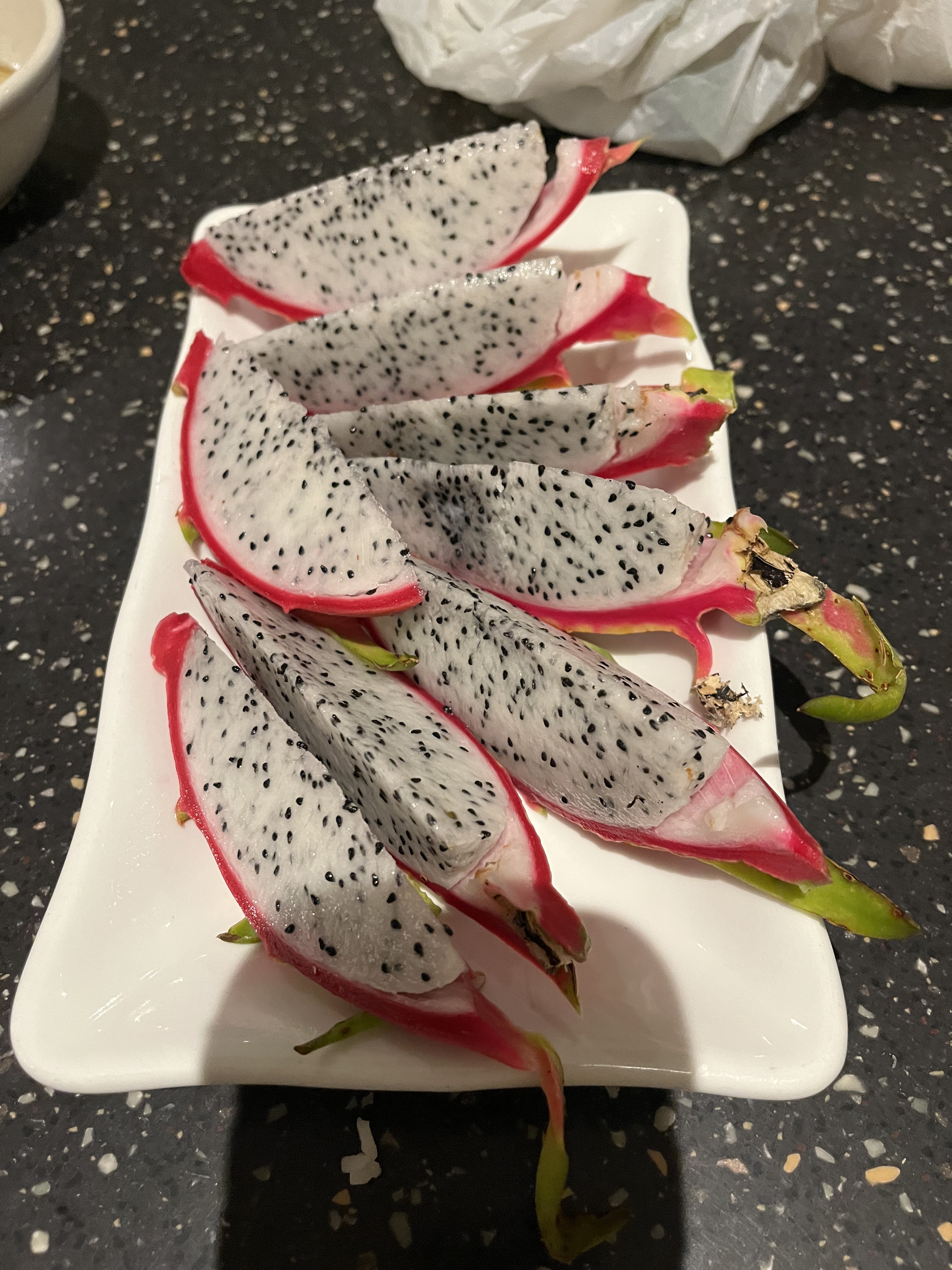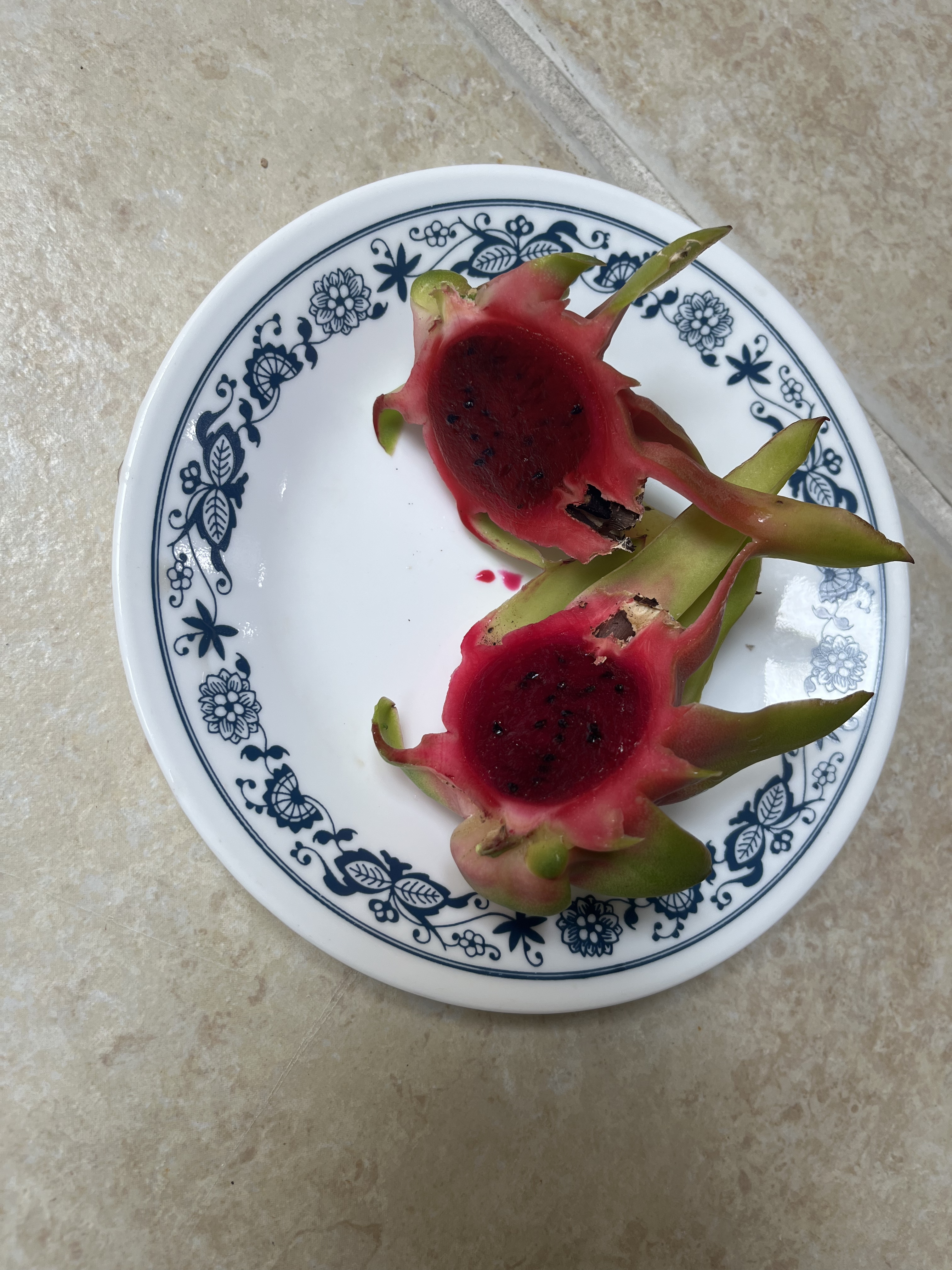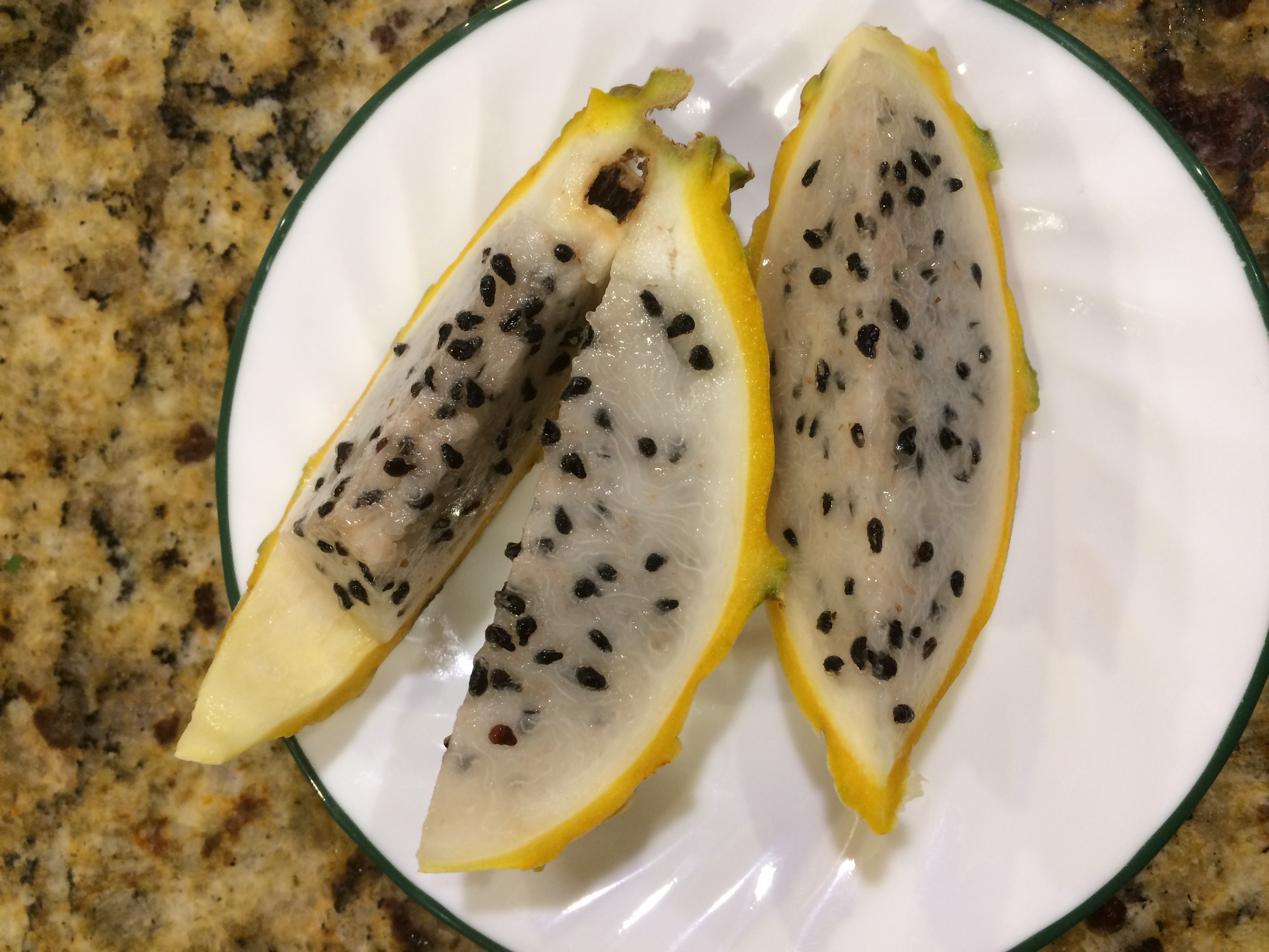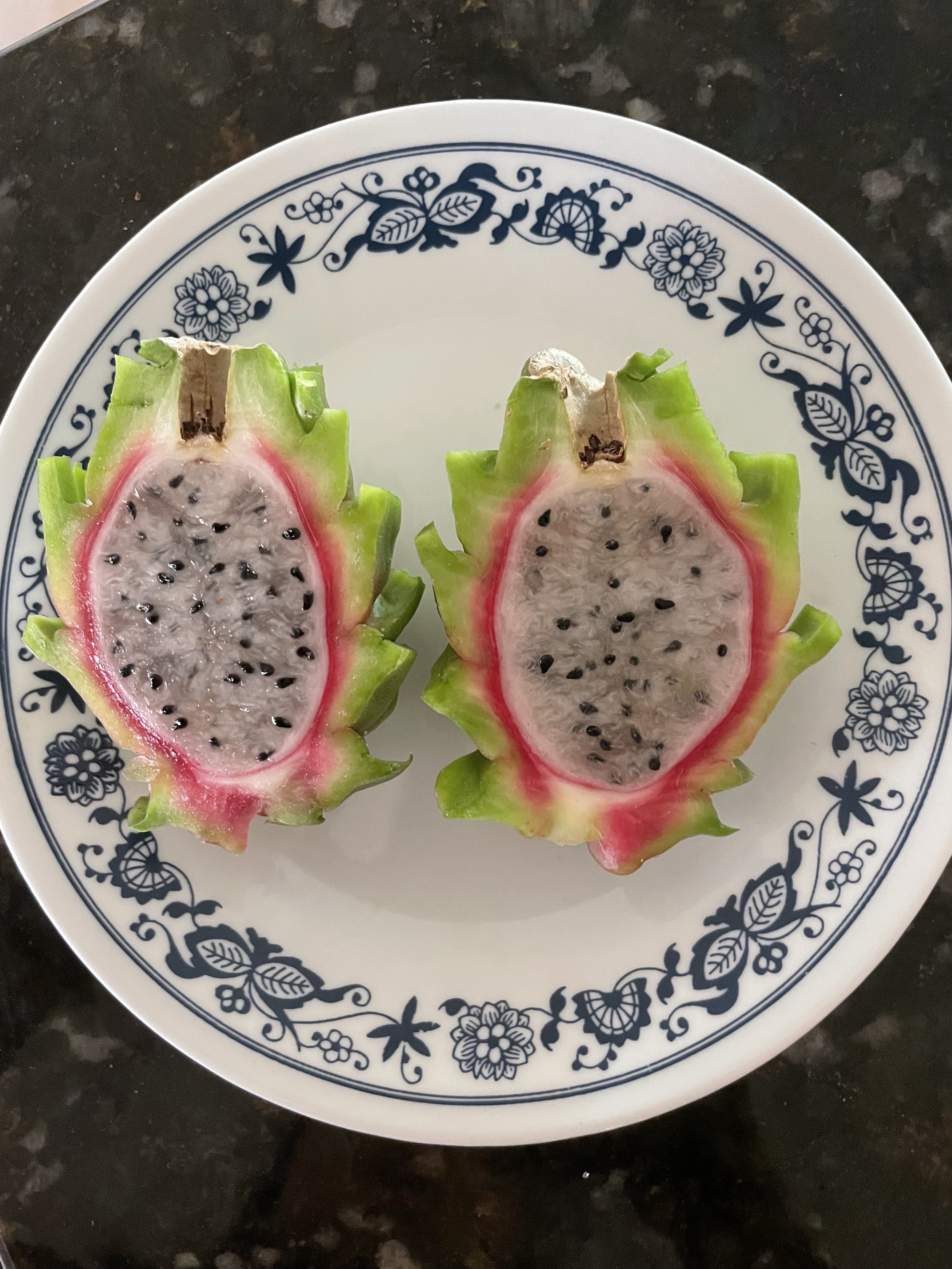 Also called pitaya or pitahaya. They are from the cactus species Selenicereus megalanthus or Hylocereus guatemalensis, Hylocereus polyrhizus, Hylocereus undatus, and their hybrids. Since 2017, Hylocerus has been considered to be part of Selenicereus and they are now considered synonymous. Approximately one month from flowering to fruit.