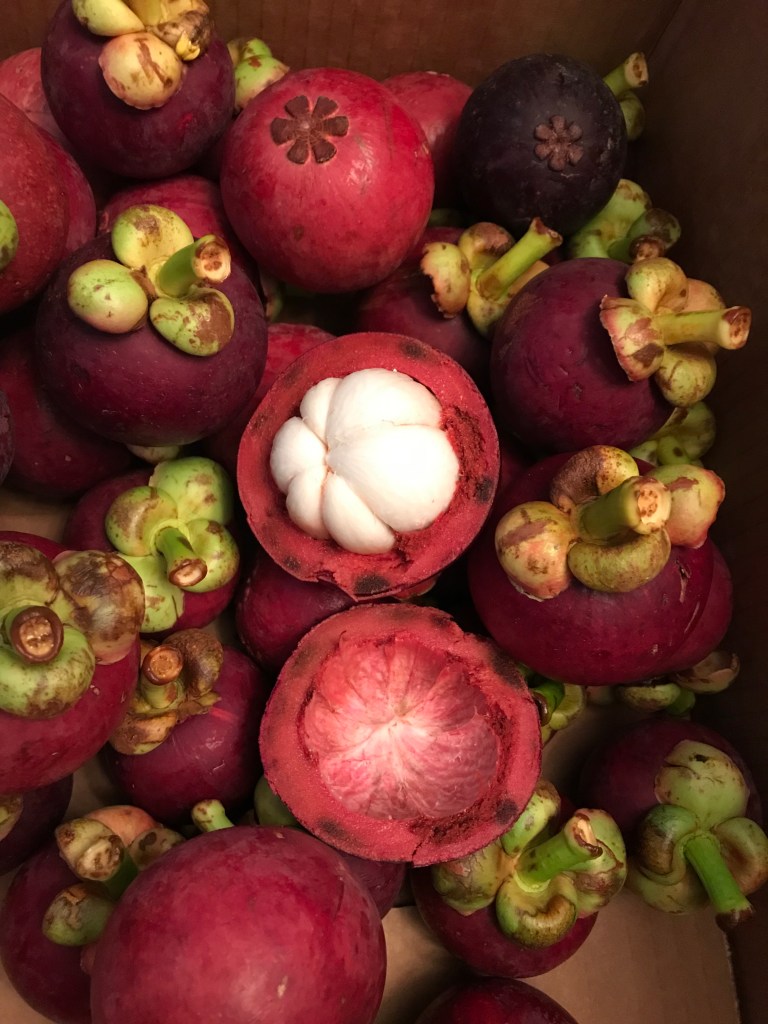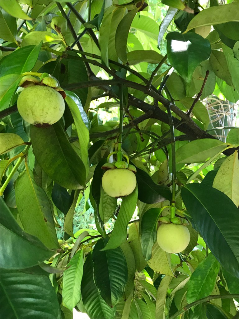 Mangosteen (Garcinia Mangostana) Grows to 20-80 feet, can be pruned to maintain at 15 feet. Bears in 7-10 years. Shade until 4-5 feet tall, then full sun. Very slow growing.