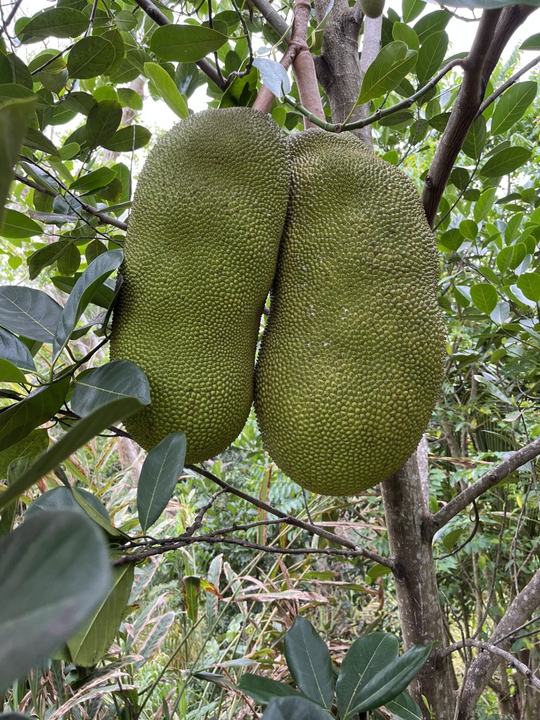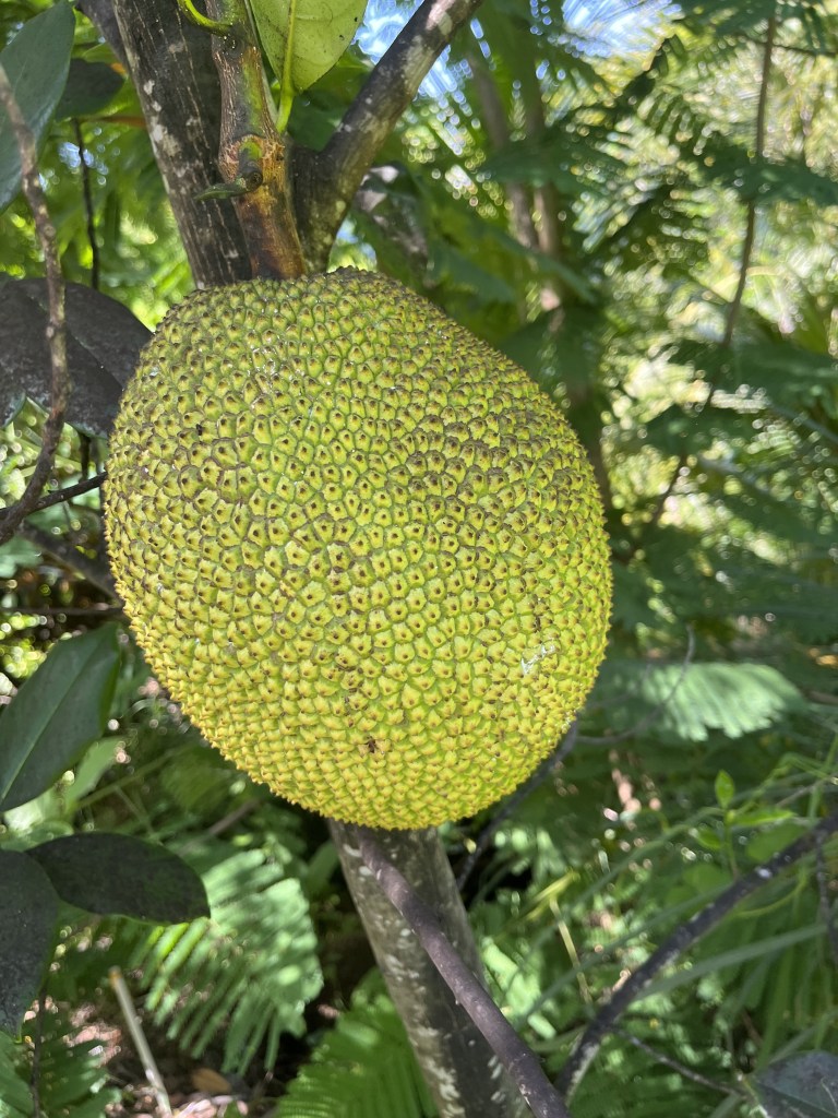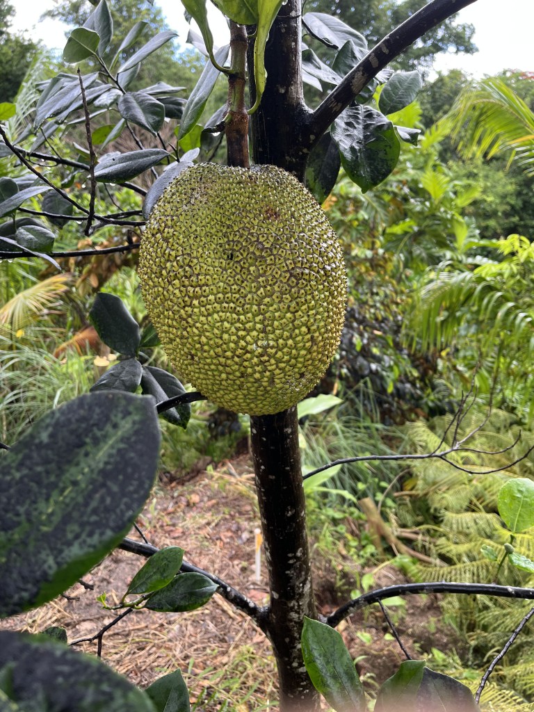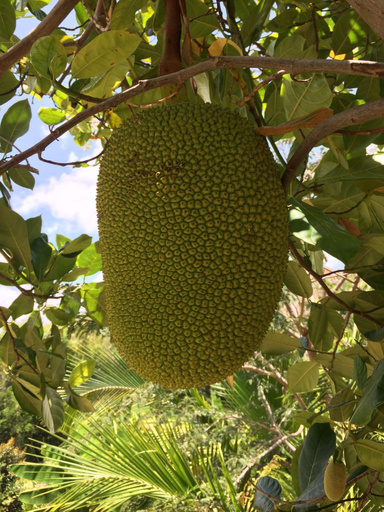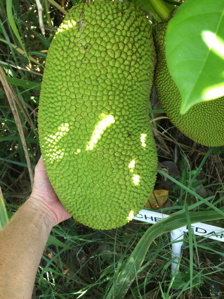 - Jackfruit #8: (22C) Located near acai. 10-16 pound fruits, Spines don’t flatten when ripe. Flowers in January, ready in March. Second Fruiting in August, ready in October – November. Sweet, not crunchy. Firm but easily bruised.