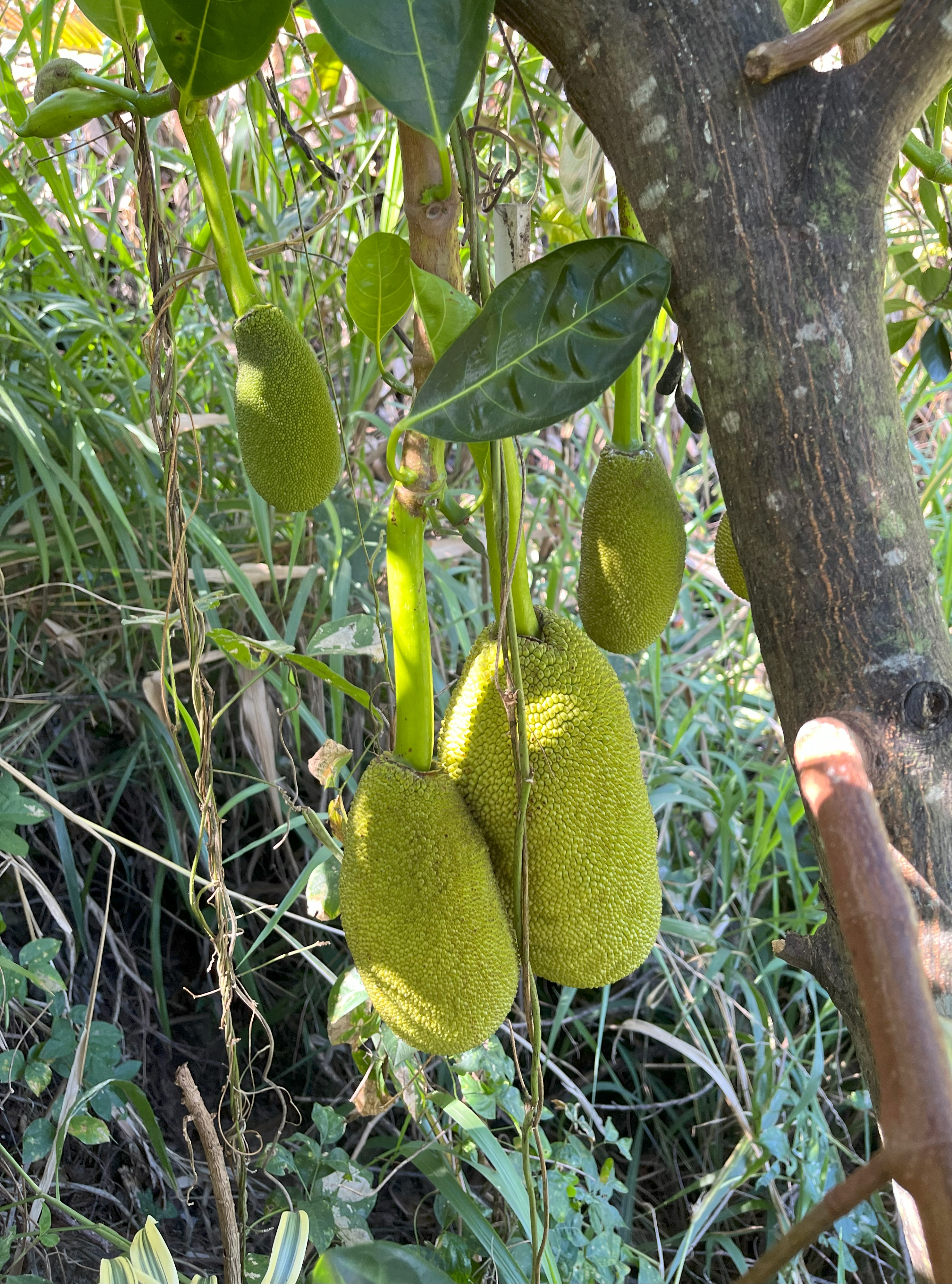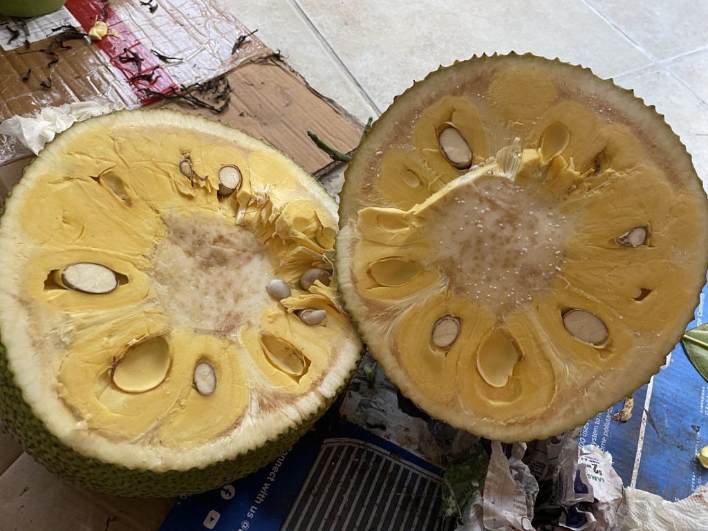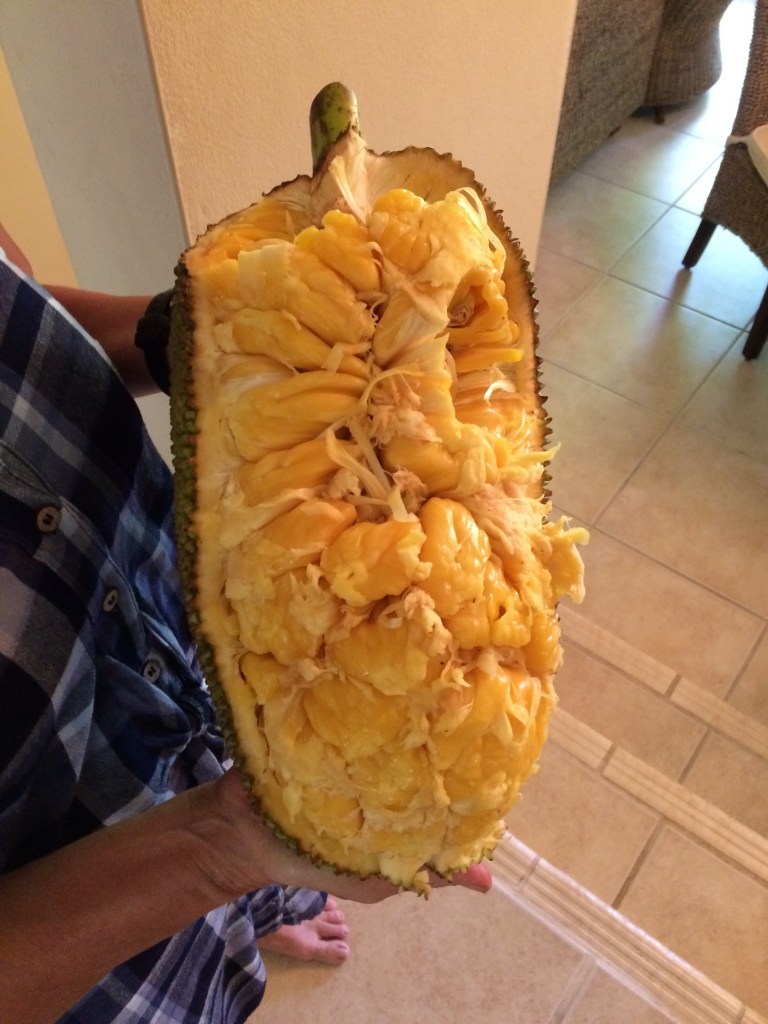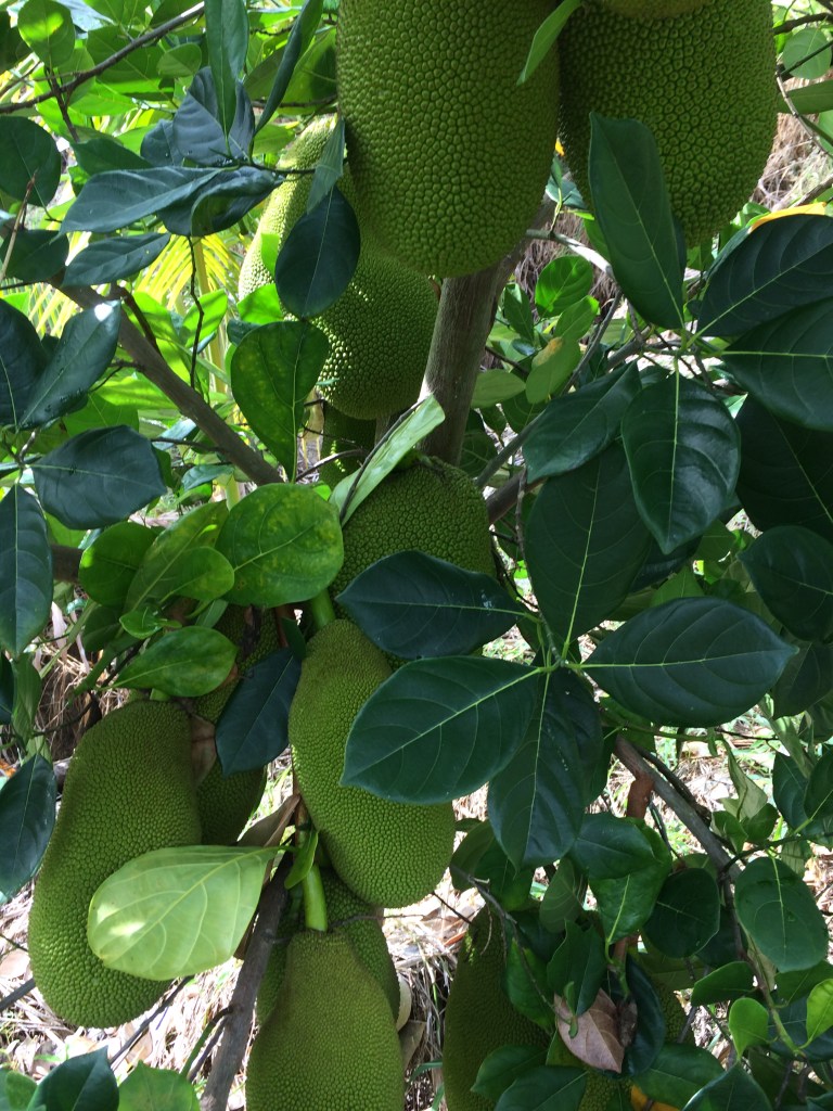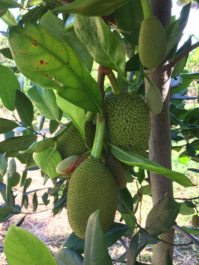 - Jackfruit #3: Ripens May-June. Sweet and chewier and more pungent than other varieties. Yellow flesh, gold- brownish rind. Fruit weighs around 15 lbs. Much of the rag is edible. Spines flatten when ripe. (Located at the top of the hill between lots 1 and 2, closer to the bakupari.)