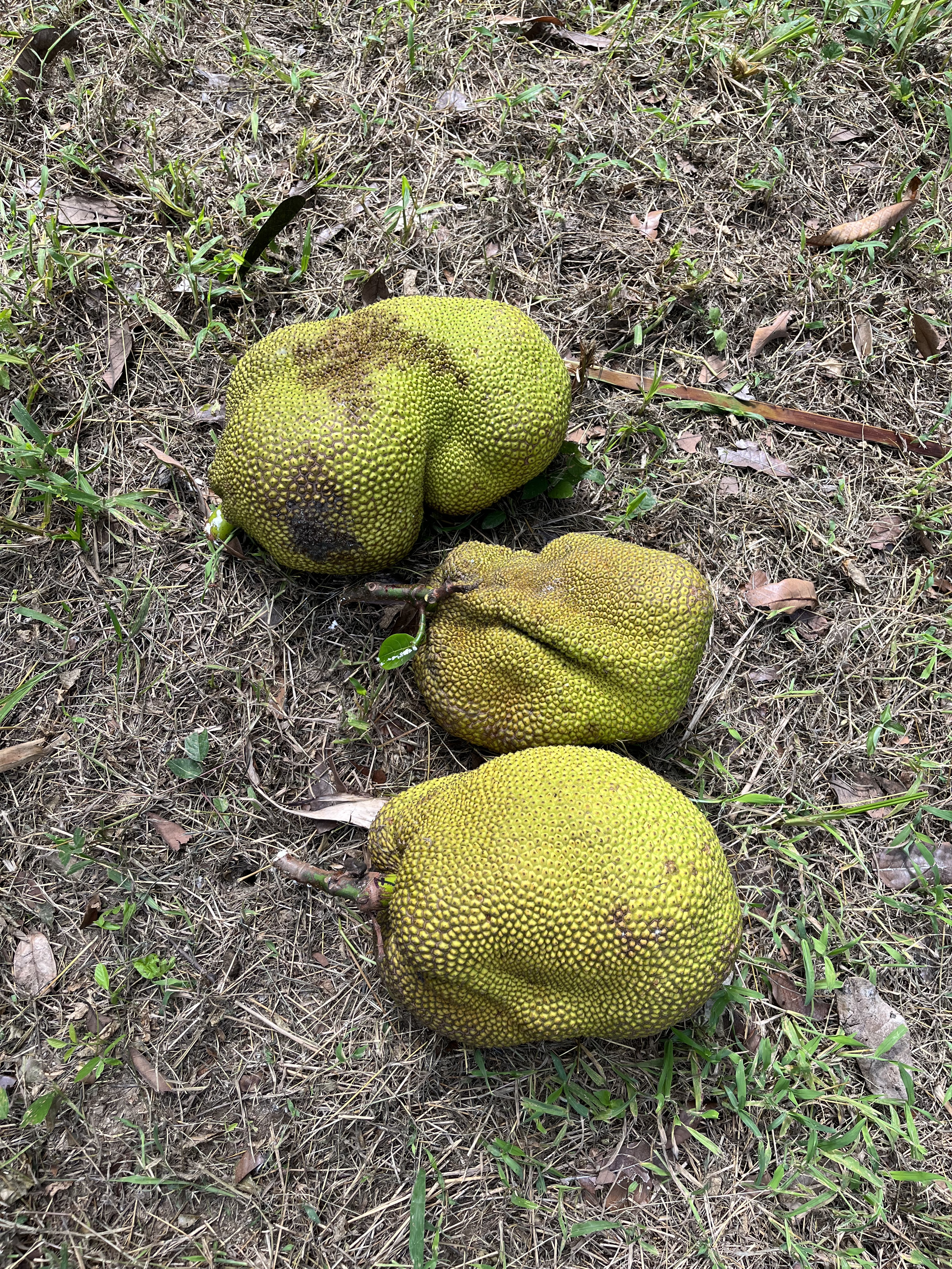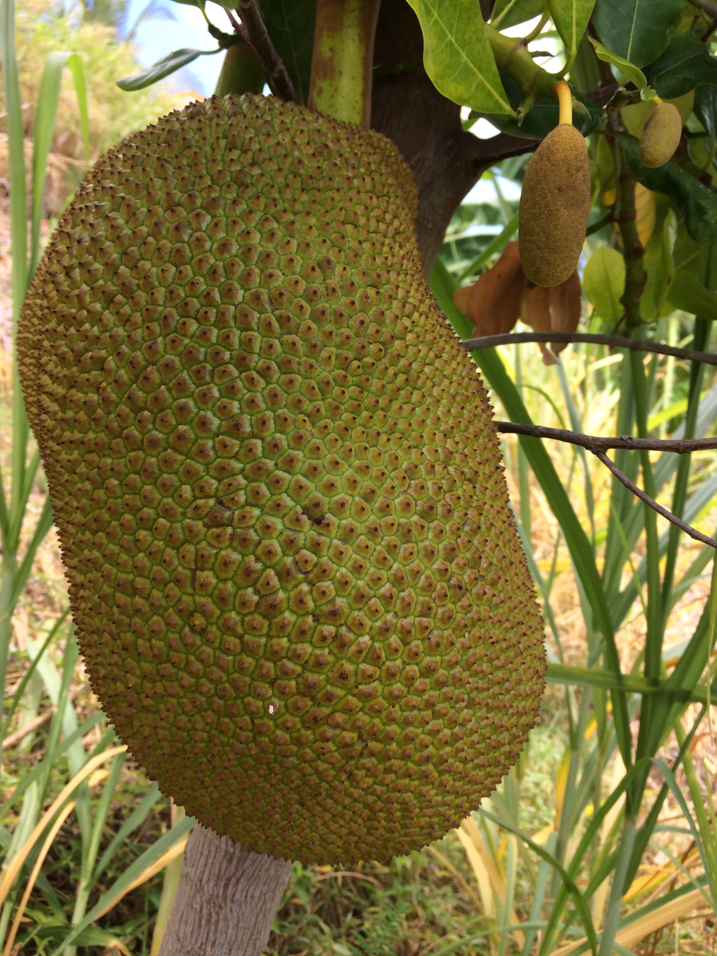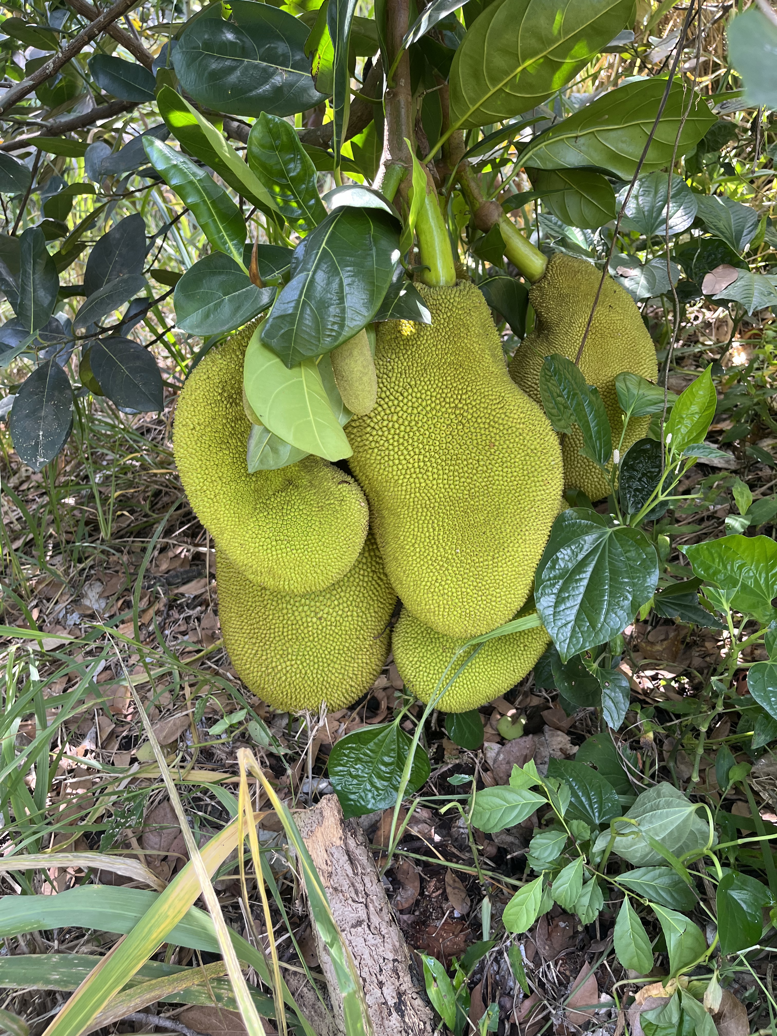 - Jackfruit #3: Ripens May-June. Sweet and chewier and more pungent than other varieties. Yellow flesh, gold- brownish rind. Fruit weighs around 15 lbs. Much of the rag is edible. Spines flatten when ripe. (Located at the top of the hill between lots 1 and 2, closer to the bakupari.)