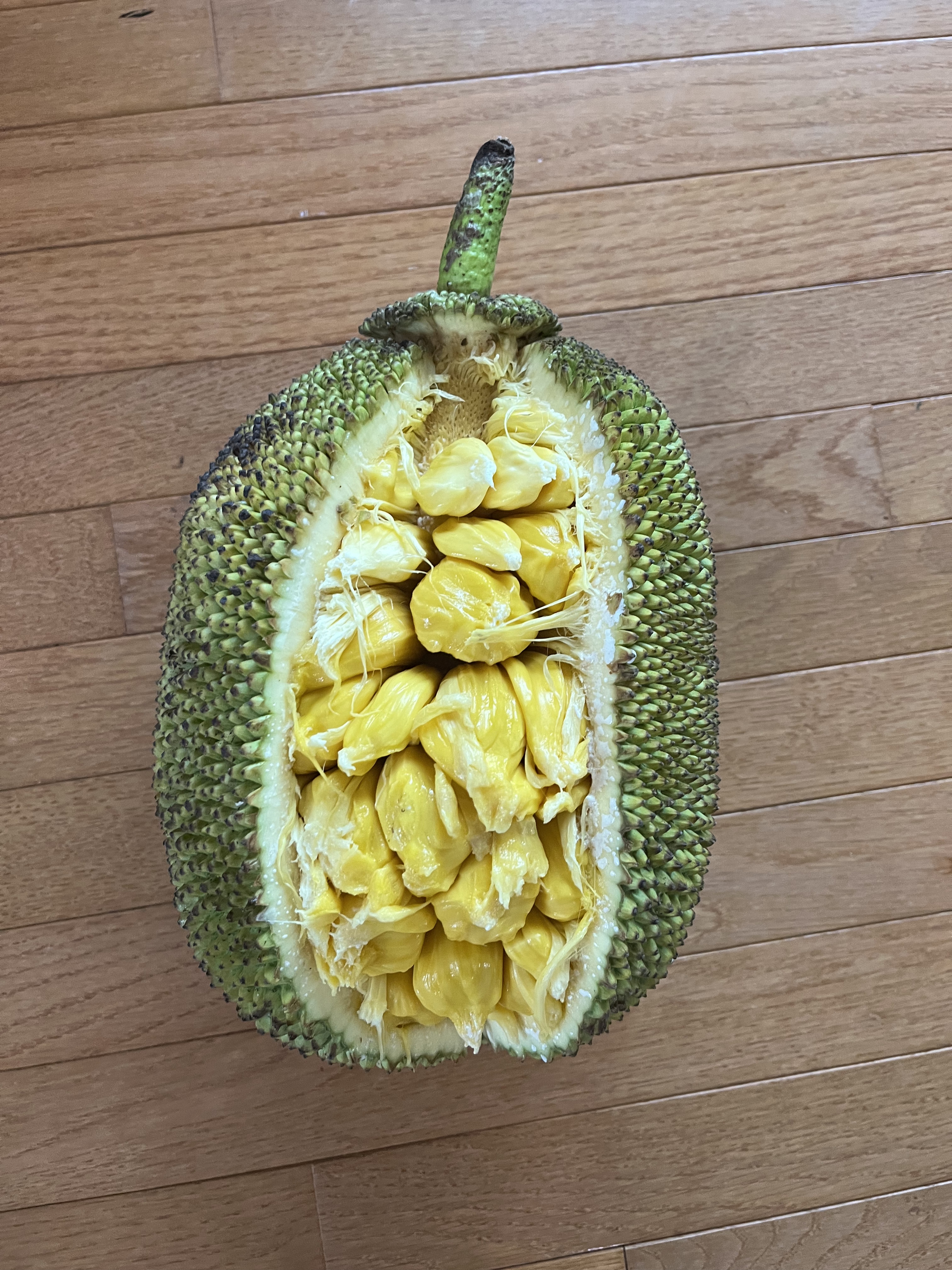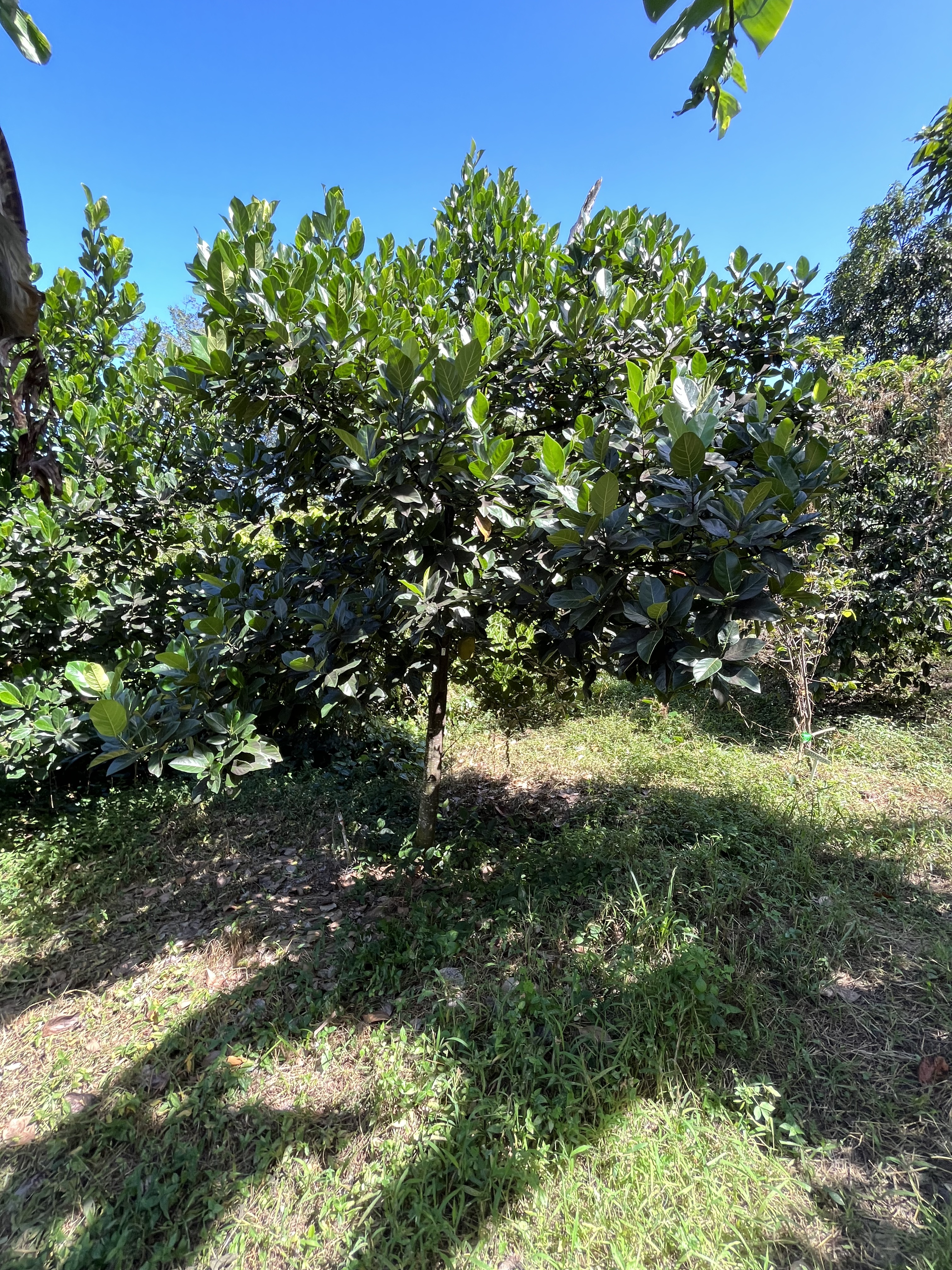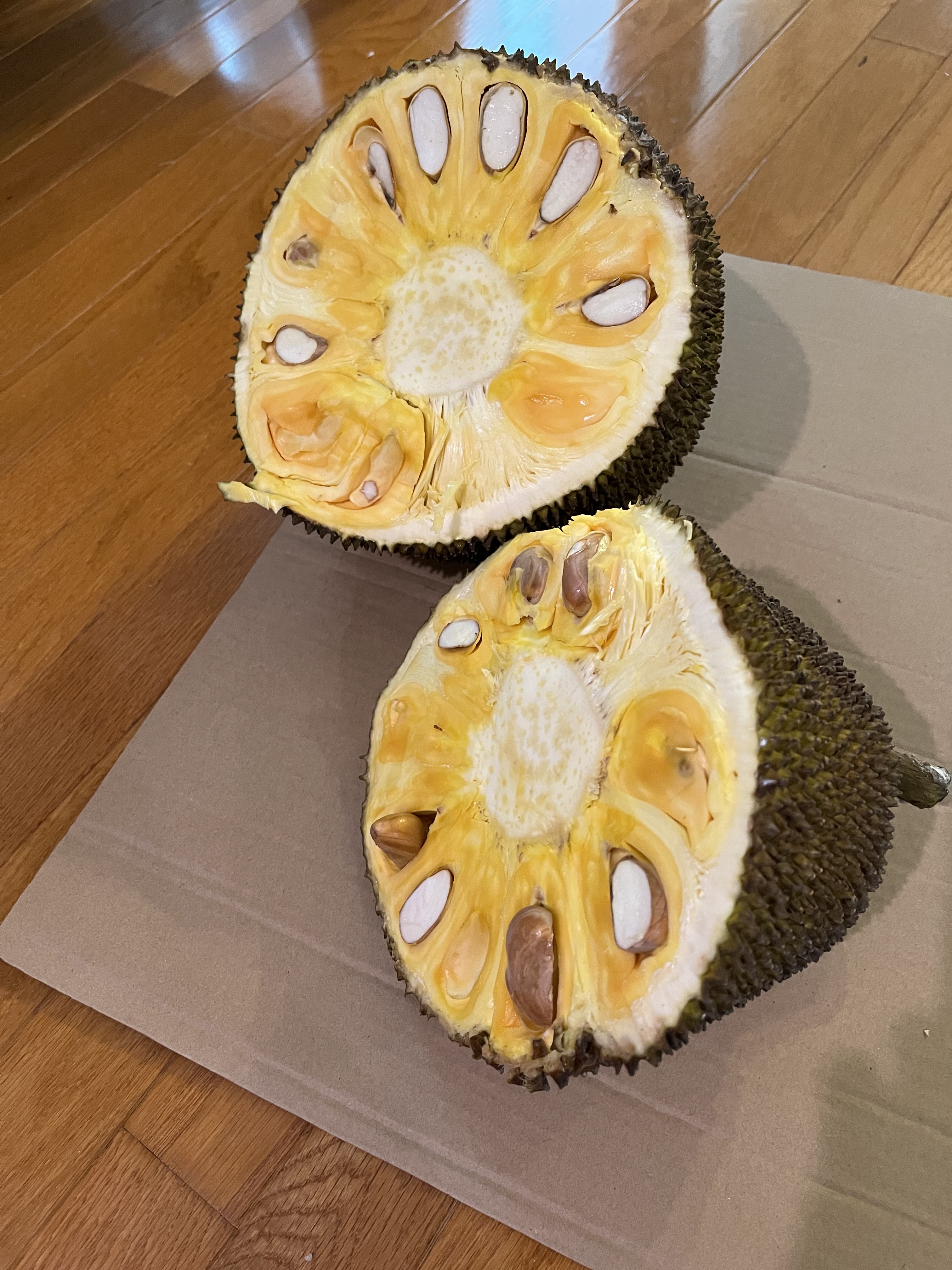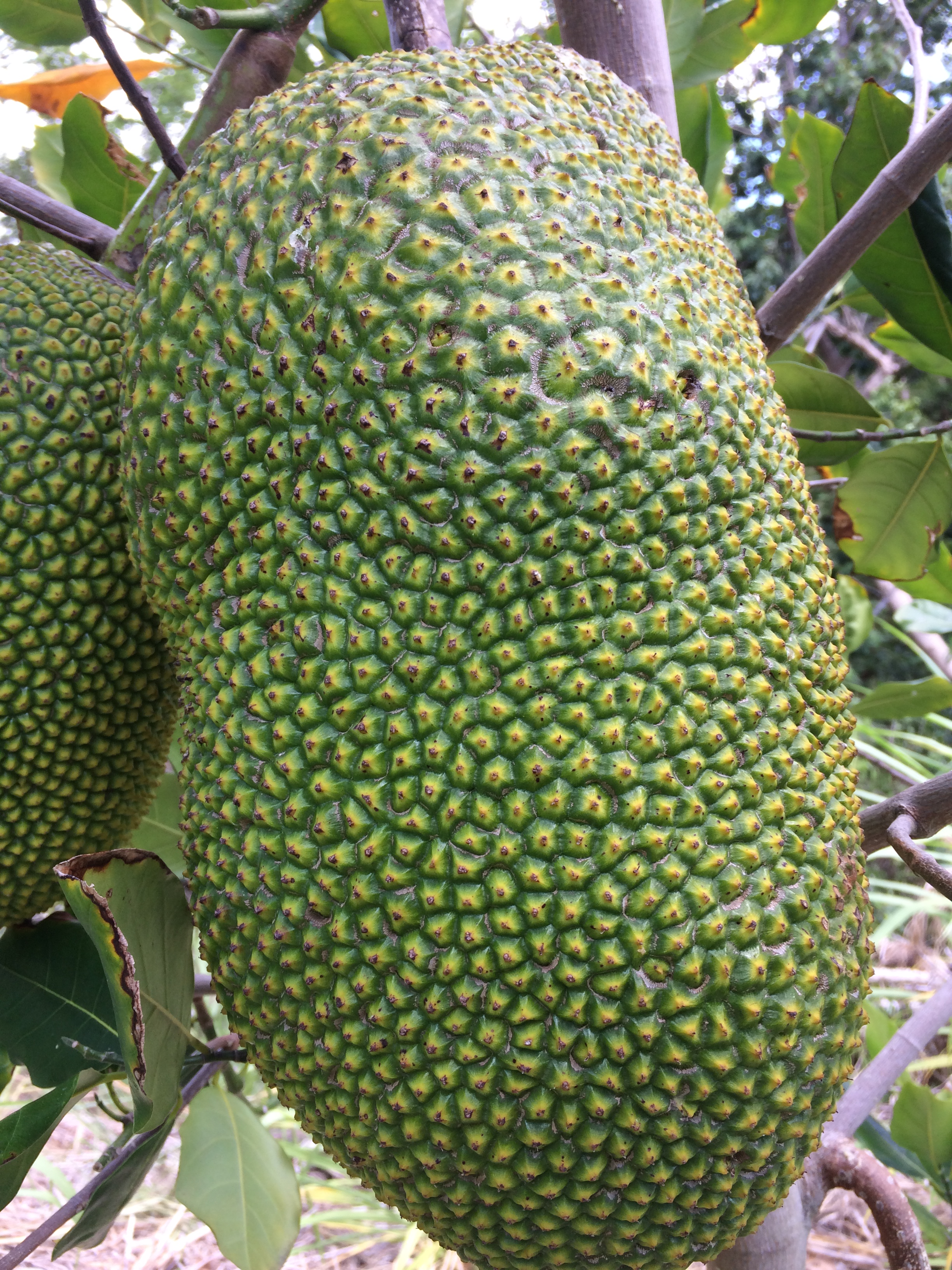 - Jackfruit #3: Ripens May-June. Sweet and chewier and more pungent than other varieties. Yellow flesh, gold- brownish rind. Fruit weighs around 15 lbs. Much of the rag is edible. Spines flatten when ripe. (Located at the top of the hill between lots 1 and 2, closer to the bakupari.)