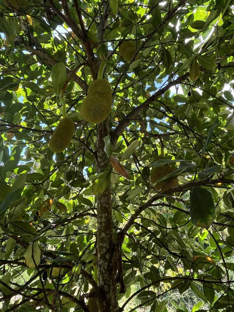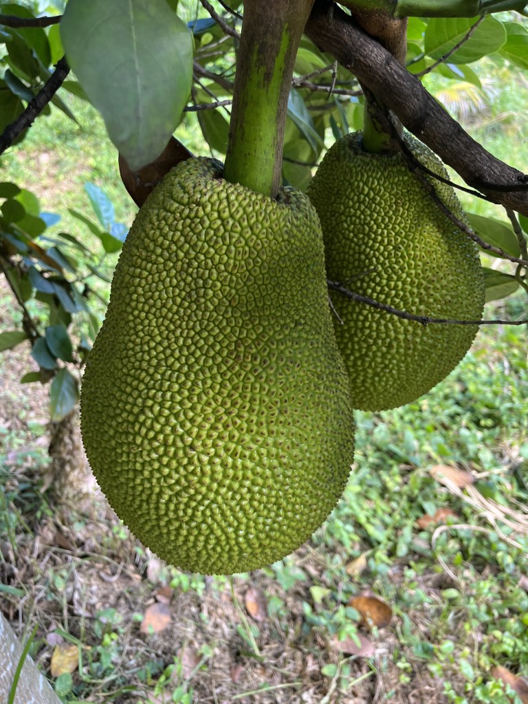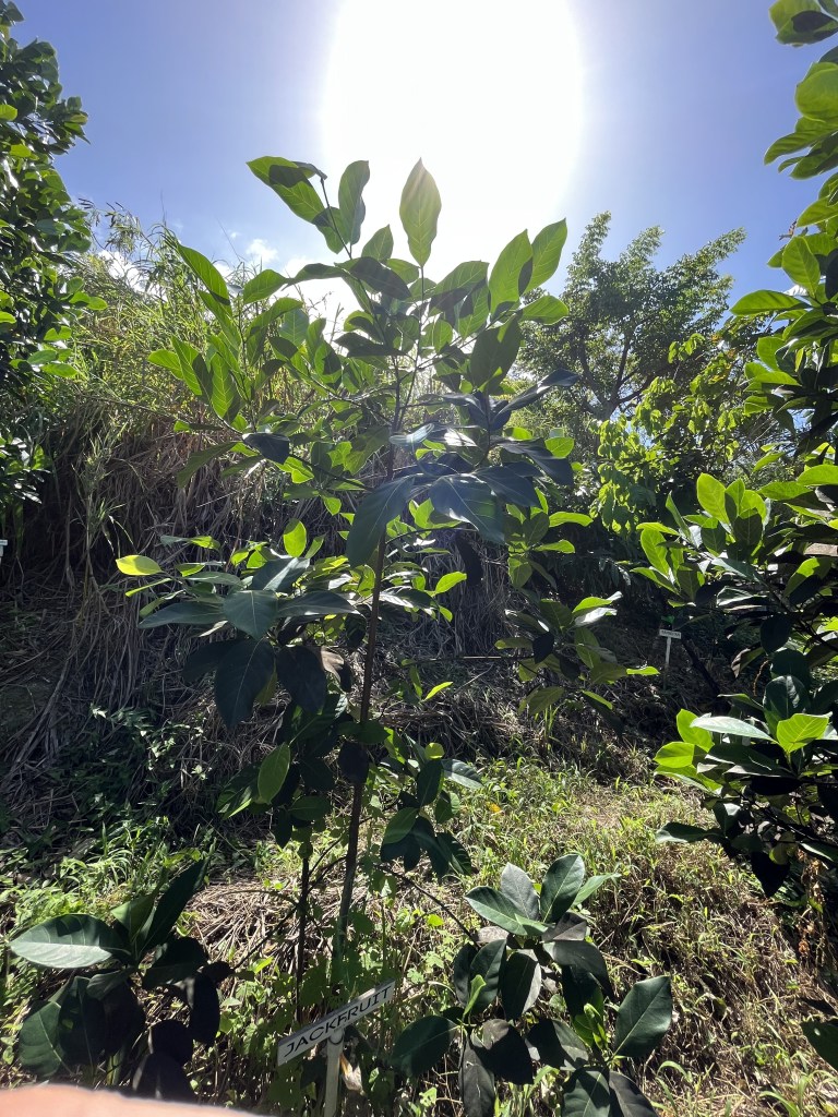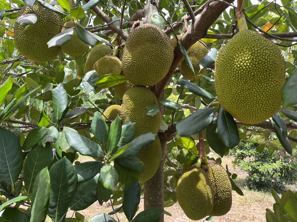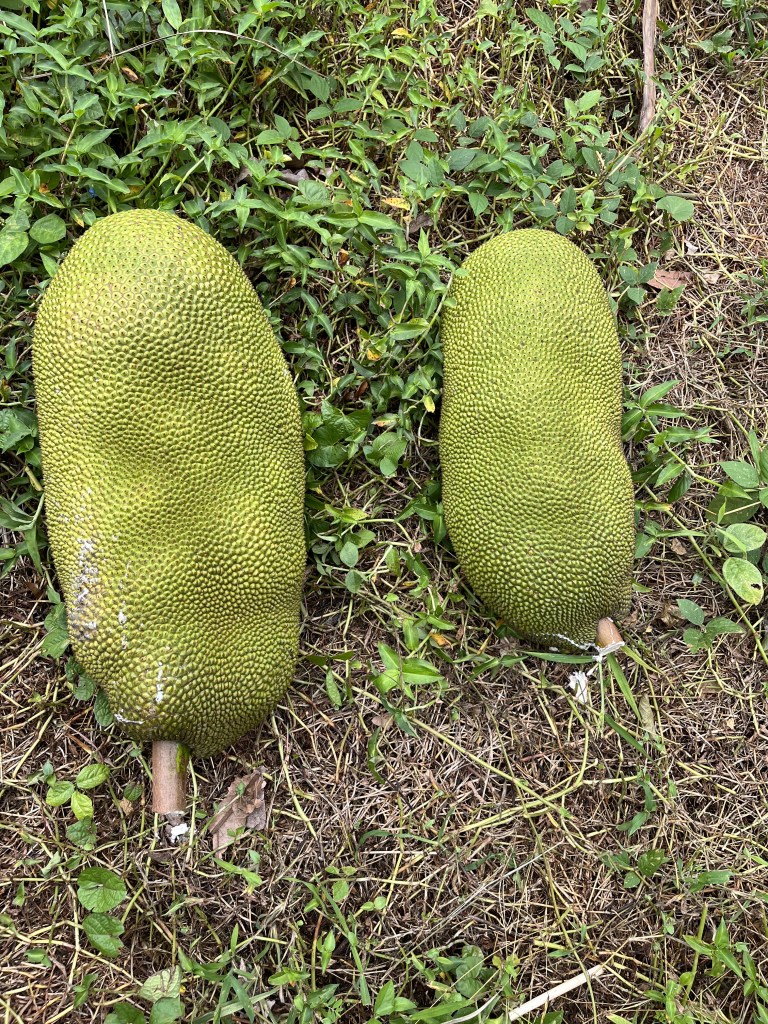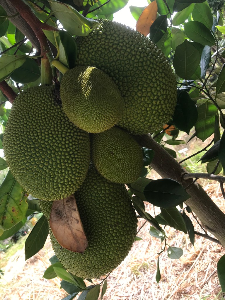 - Jackfruit #6: Sweet, Crisp fruits weigh about 20 Lbs. Ripens in August. Located on eastern side of lot one near the starfruit tree.