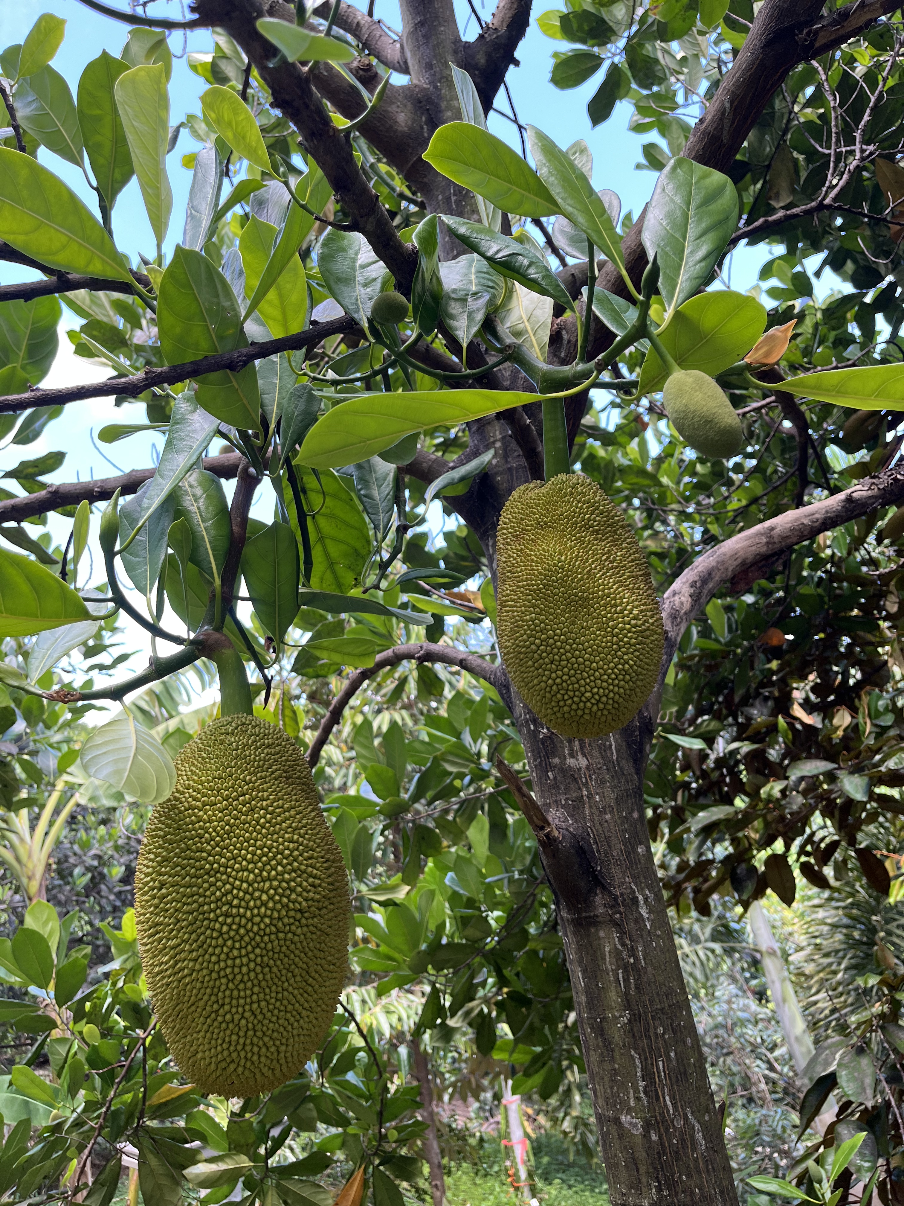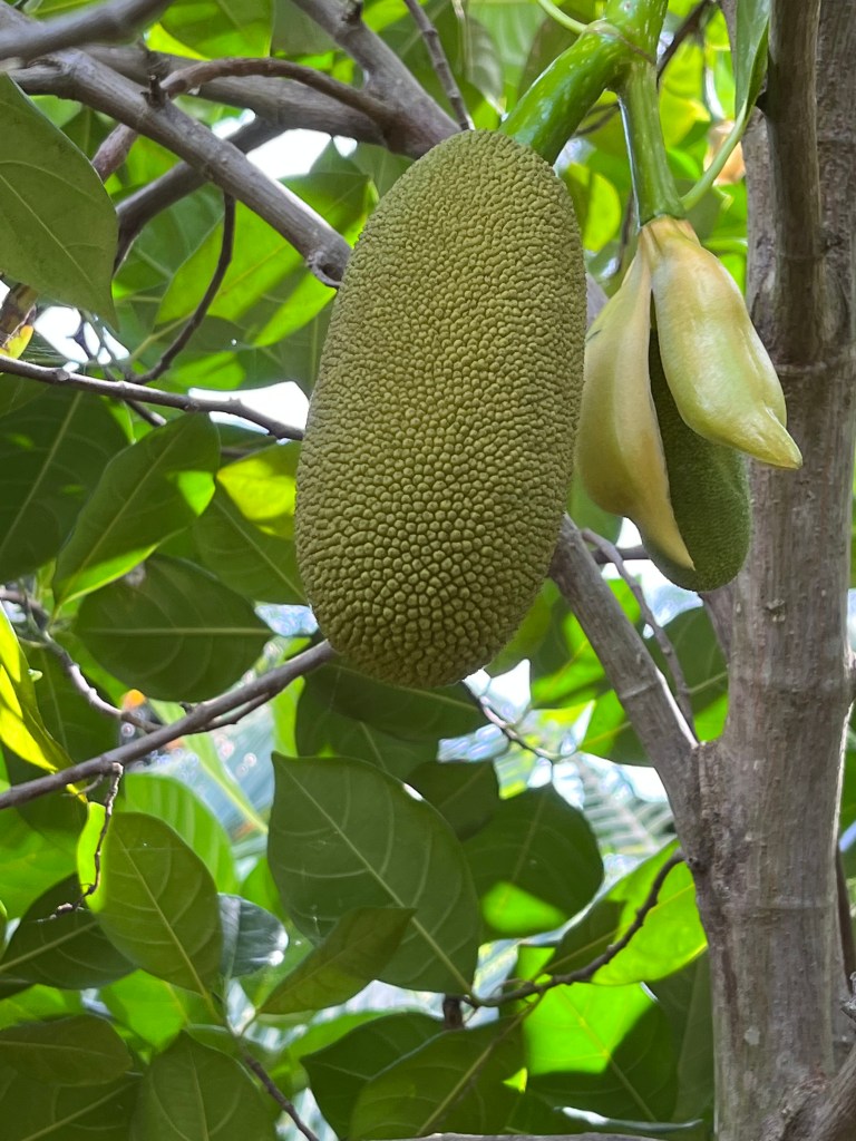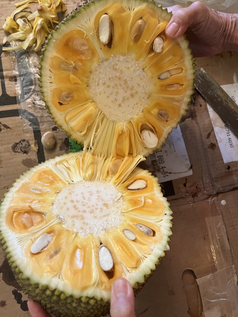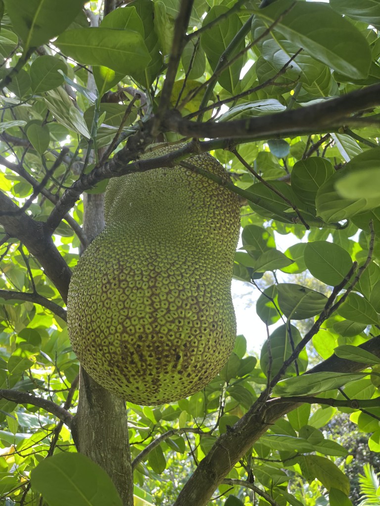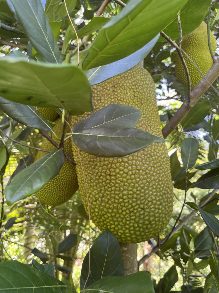 - Jackfruit #6: Sweet, Crisp fruits weigh about 20 Lbs. Ripens in August. Located on eastern side of lot one near the starfruit tree.