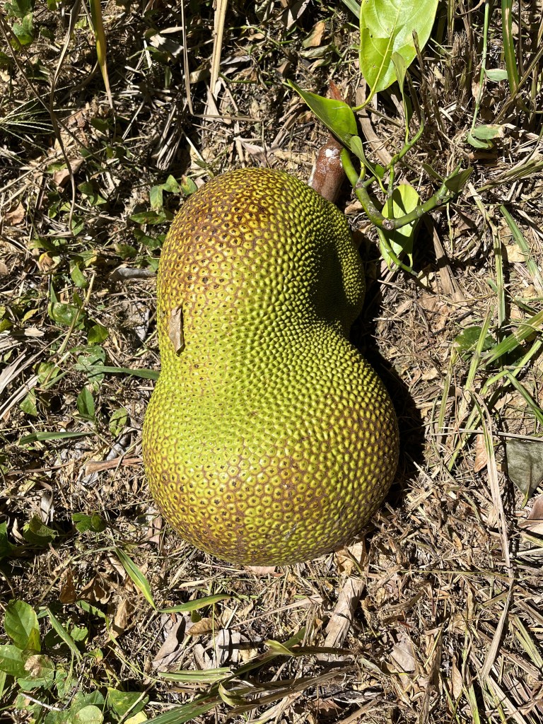 - Jackfruit #5: Fruits weigh 15-20 lbs. Ripens June- July; smaller crop of smaller fruits in November . Fruit is large, very irregular with green-brown rind. Spines don’t flatten. Very Sweet, crisp. Most popular so far. (Located between lots 1 and 2, in the middle near the orejona. )