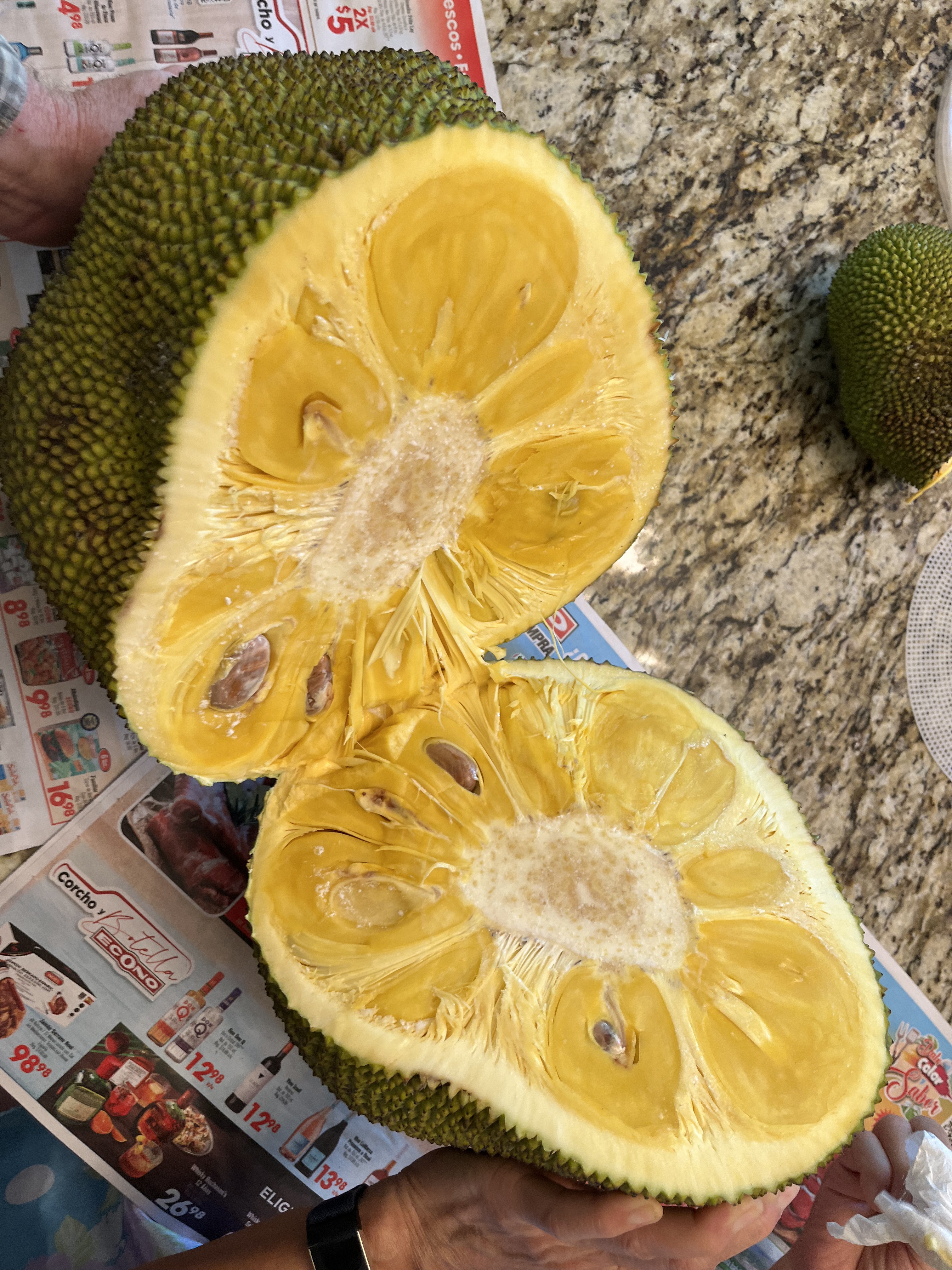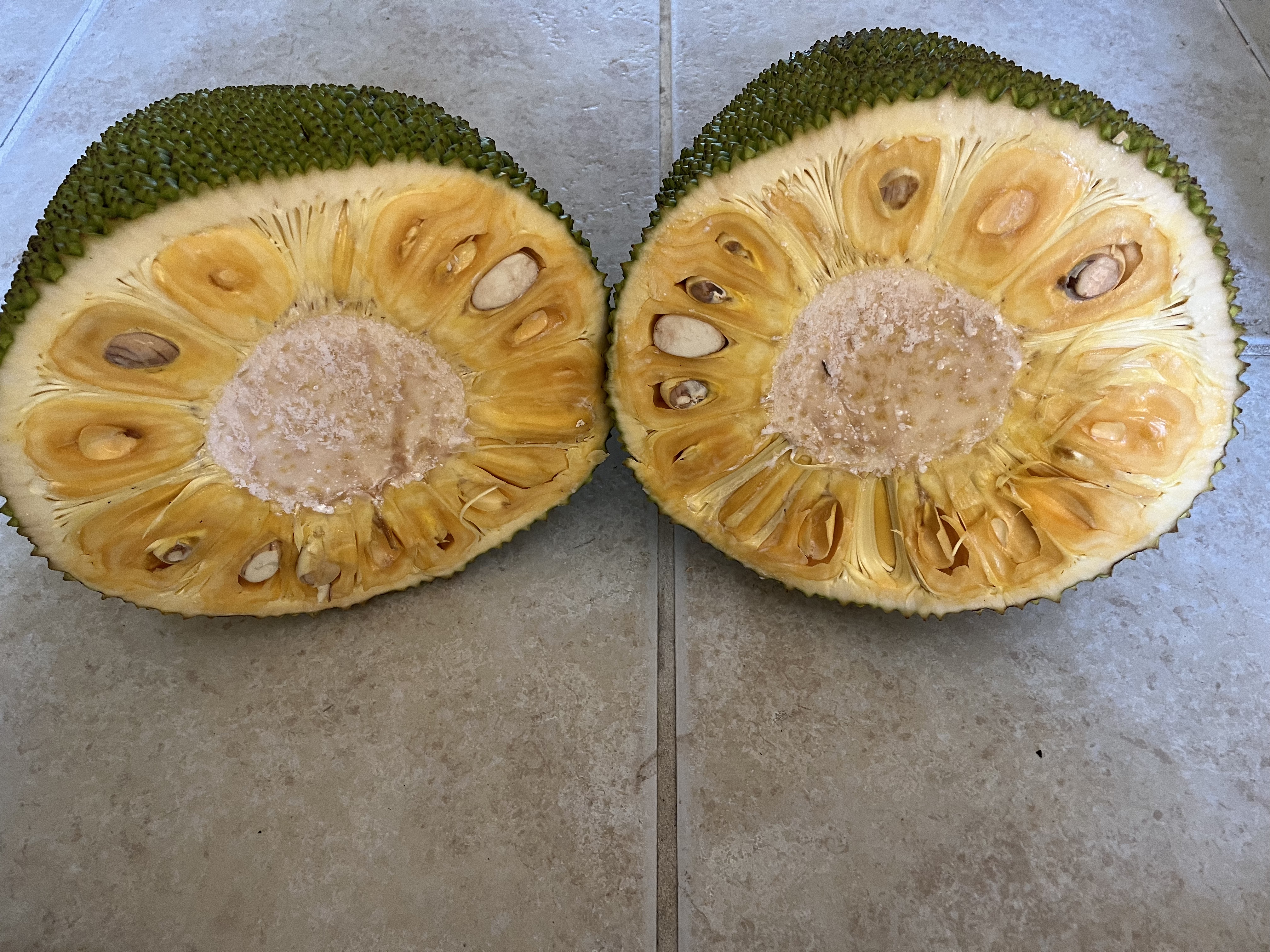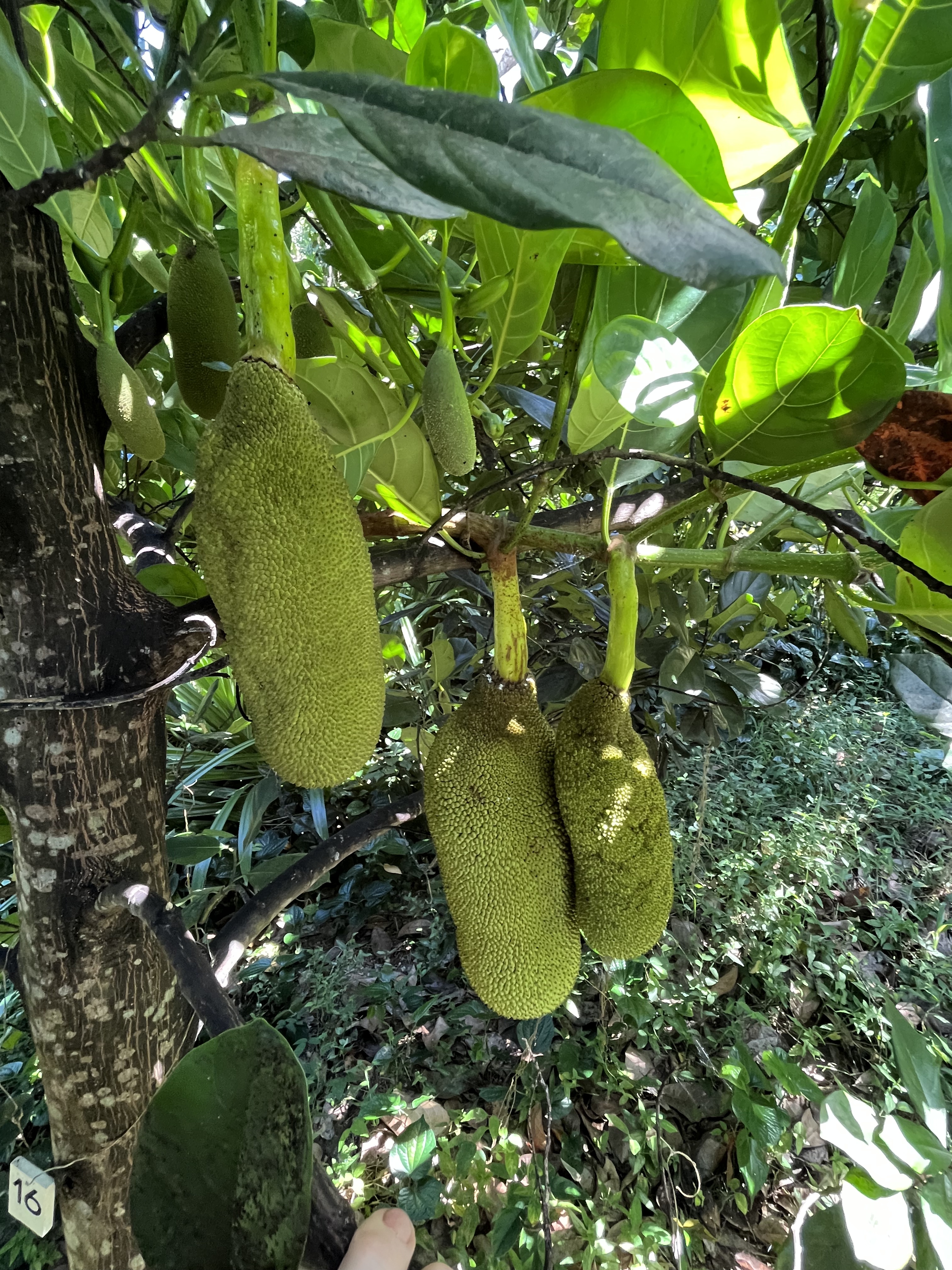 - Jackfruit #16: Located by soursops, jackfruit #7. Flowering in February, ready June/July. 24 lb fruits. Smaller fruit sections, but very sweet.